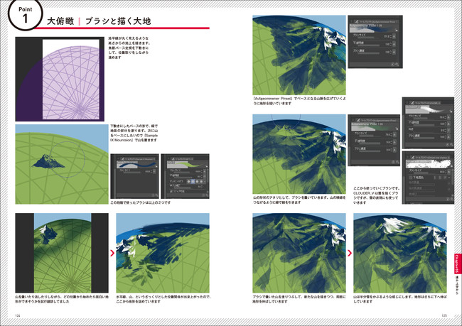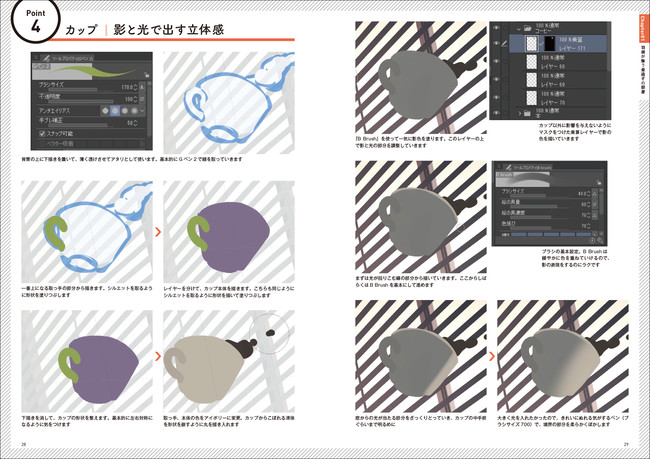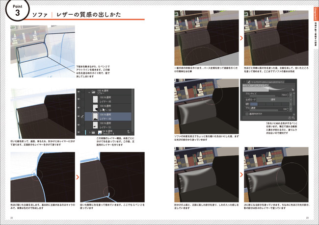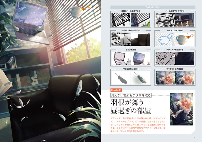 カーテン、ブラインド、ソファ、棚といったよくある室内の風景から、光源 、夜の森、上空から見下ろす地上など。屋内屋外のシチュエーションで「描かなきゃいけない、描いてみたい」背景やプロップ(小物)を手軽に、キレイに、素早く描くためのテクニックを紹介します。5つのシチュエーションの中から、25のテクニックをメイキングとともに解説。形状の取りかたから、色の塗りかたまでワンストップで分かります。