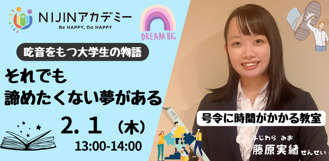 日本中の学校をハッピーにする株式会社NIJIN(本社:東京都江東区、代表取締役:星野達郎)が運営する小中学生向けオンラインスクール「NIJINアカデミー」は、このたび、吃音をもちながら教員の夢に挑戦する藤原実緒氏をお招きし、オンライン特別授業を開催します。