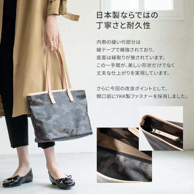 日本製の丁寧な縫製と上品な迷彩柄が、いつものコーデを格上げするトートバッグ。