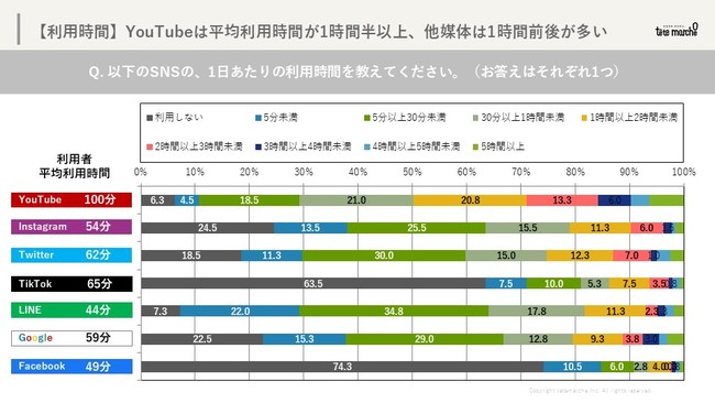 【SNS媒体別の1日当たりの利用時間】という項目において、TikTokをそもそも利用していないZ世代は63%にものぼり、Z世代の中でもTikTokを利用していない層が存在する結果となりました。これに対して川又は、“Z世代向け施策を企業が企画し、SNSの媒体選定をする際に、安直にTikTokと決めずに媒体ごとの特性や運用における目的を正しく理解して、媒体選定することが重要である”と分析結果を述べました。