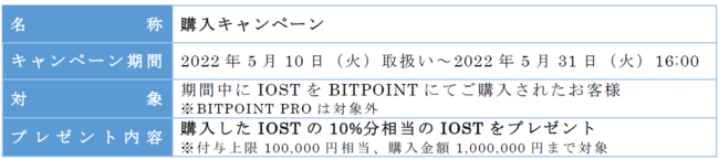 2. IOSTをBITPOINTにてご購入で、もれなく購入金額10%相当のIOSTをプレゼント(付与上限100,000円相当、購入金額100万円まで対象)