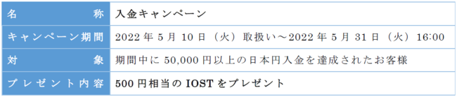 1. 50,000円以上の日本円入金で、もれなく500円相当のIOSTをプレゼント