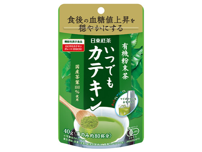 健康志向の高まりを背景に、手軽に粉末茶が楽しめる「日東紅茶 有機粉末茶 いつでもカテキン 40g」が機能性表示食品としてリニューアルします。茶葉をそのまま食べる粉末茶だから、有機栽培の国産茶葉にこだわりました。また、殺菌済み茶葉を使用しており、ホットはもちろんアイス飲用でもお楽しみいただけます。