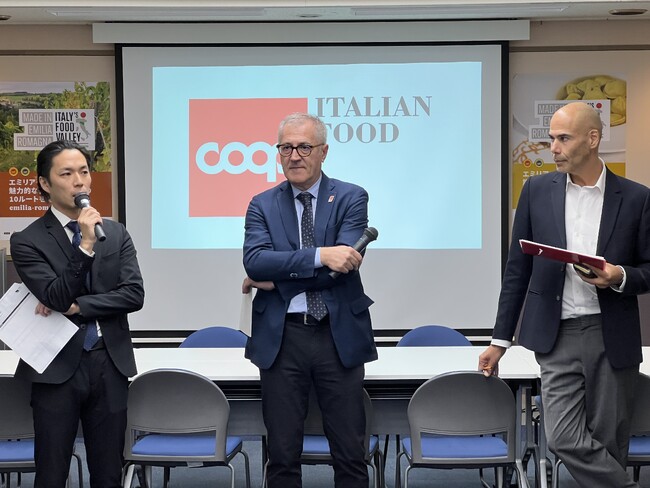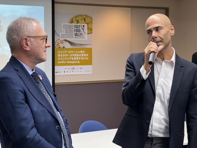 在日イタリア商工会議所は、11月16日(木)、イタリアの美食の宝庫・エミリア・ロマーニャ州経済視察団来日を記念したBtoBイベントを、大阪市中央区のマイドームおおさかにて開催しました。世界イタリア料理週間(11月13日〜19日開催)事業の一環として、イタリアを代表する美食の宝庫として名高いエミリア・ロマーニャ州からステファノ・ボナッチーニ州知事、同州経済開発・グリーン経済・労働・研修担当会議員のヴィンチェンツォ・コッラ氏、そして同州農業・農業食品・狩猟・漁業会議員のアレッシオ・マンミ氏や初めとする政府要人の他に食品関係企業の代表者らが約80名来日。