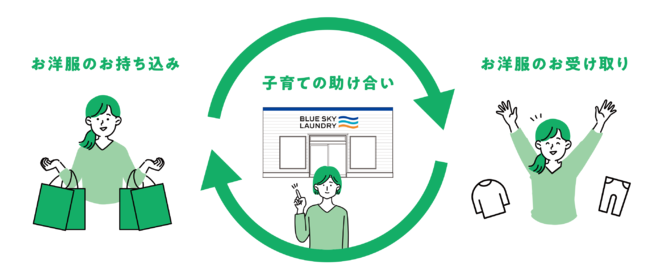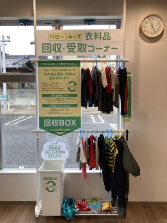 一部店舗のブルースカイランドリーにて衣類の回収BOX、受け取りラックを設置し、ベビー・子供服の回収・受け取りを始めることをお知らせいたします。