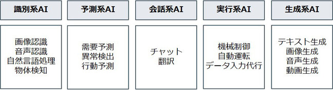 また、これら2つのメニューに共通して、AI技術のセキュリティ、倫理、社会的影響、プライバシー・個人情報保護等に関する法規制対応といった課題対応やリスク管理についても、コンサルティングを行います。なお、本サービスが対象とするAIは、生成系AIだけでなく、識別系、予測系、会話系、実行系等の各種AIです(図2)。
