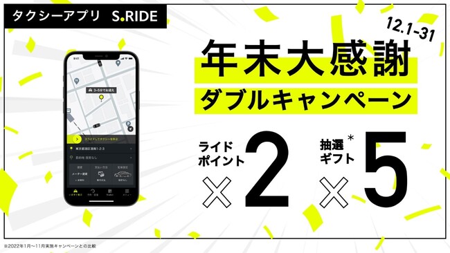 タクシーアプリ 「S.RIDE」を提供するS.RIDE株式会社(本社:東京都港区、代表取締役:西浦賢治、以下S.RIDE)、は、2022年12月1日(木)〜12月31日(土)の期間中、S.RIDE史上最大規模となる「S.RIDE年末大感謝ダブルキャンペーン」を実施いたします。期間中は、S.RIDEでタクシーに乗れば乗るほどお得になる特典を複数ご用意しております。