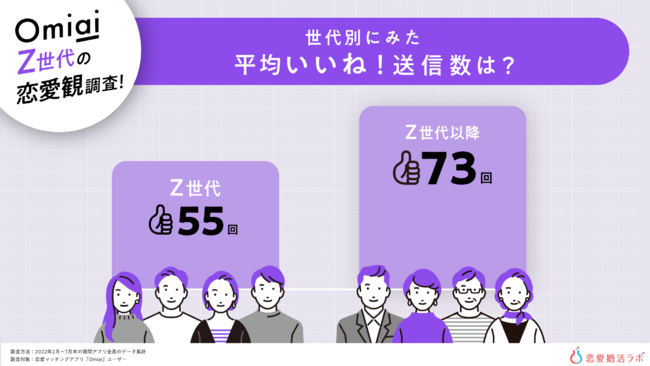 恋愛マッチングアプリ「Omiai」では、異性に対して「いいね!」を送信することで「あなたのことが気になっています」とアピールすることができます。「いいね!」送信数を世代別で見ると、Z世代はZ世代以降と比べ「いいね!」の送信数が約3割少ないことがわかりました。