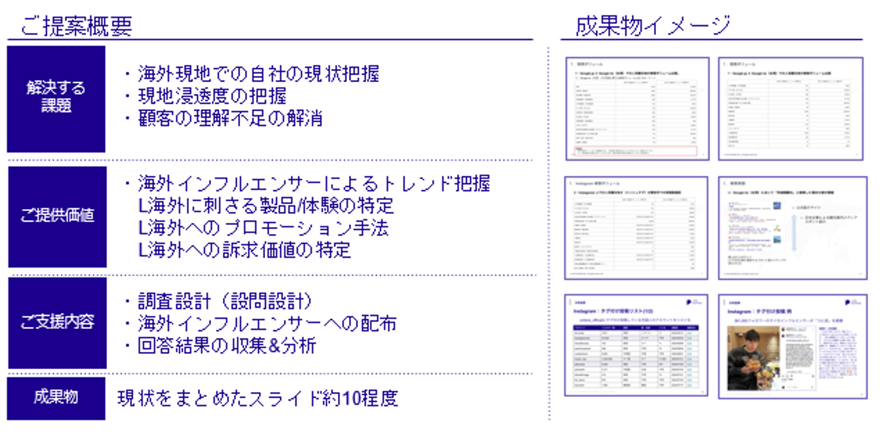 - 現地目線で「海外に刺さる」情報を収集できる- 「SNS を知り尽くす」プロによる回答が得られる