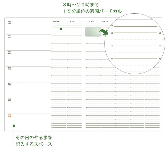 週間バーチカルは6〜22時の時間目盛り。そのうち8時〜20時は15分単位の時間目盛りです。