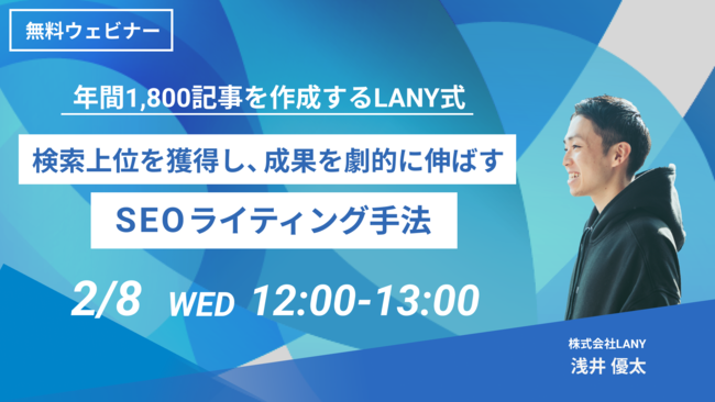 年間1,800記事を作成するLANY式 - 検索上位を獲得し、成果を劇的に伸ばすSEOライティング手法を解説するウェビナーを2/8(水)に開催