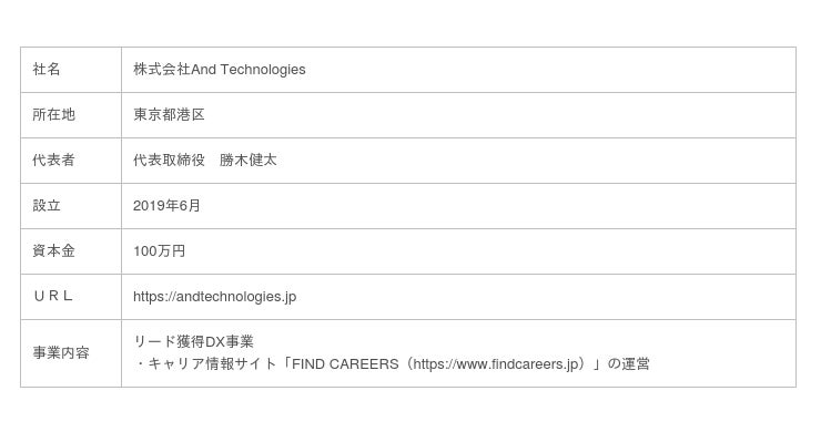 And Technologiesは、転職希望者と転職エージェントおよび人材プラットフォームを結びつける、リード獲得DXプラットフォーム『FIND CAREERS(https://www.findcareers.jp)』を運営し、ハイクラス人材向けのキャリアについてのニュース、イベント情報、インタビューなどの信頼性の高い情報コンテンツを発信しております。