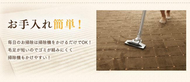 毎日のお掃除は掃除機をかけるだけでOK!毛足が短いのでゴミが絡みにくく掃除機もかけやすいです。