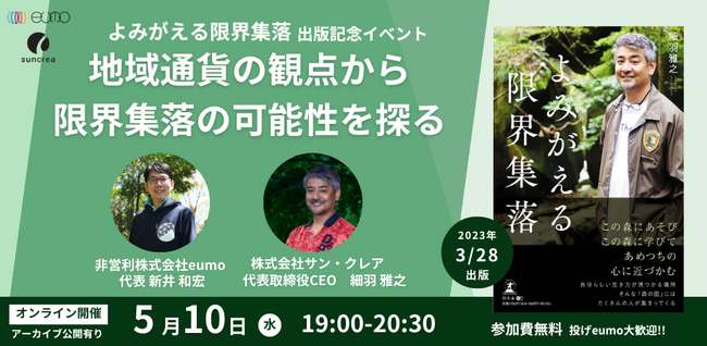 瀬戸内を中心に、地域とつながるホテルを7棟展開する株式会社 サン・クレア(広島県福山市、代表取締役CEO 細羽雅之、以下サン・クレア)は非営利株式会社eumo(東京都港区、代表取締役 新井和宏、以下eumo)と共に、細羽雅之初の著書となる「よみがえる限界集落」の出版を記念したオンライントークイベント「地域通貨の観点から、限界集落の可能性を探る」を2023年5月10日に開催します。