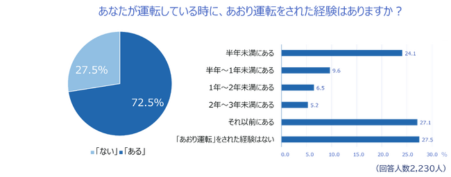 1.あおり運転をされた経験があるドライバーは72.5%と、昨年の53.5%から19ポイントの上昇。半年でも24.1%の結果に。