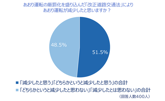 2.2020年6月末に施行されたあおり運転の厳罰化を盛り込んだ「改正道路交通法」により、あおり運転が「減少したと思う」と回答したドライバーは51.5%。