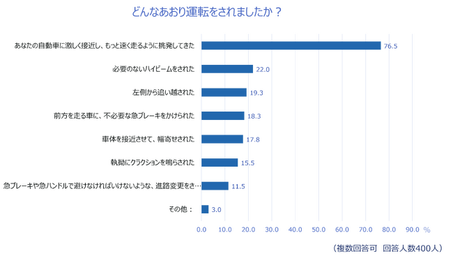 3. 遭遇したあおり運転は、「激しく接近し、もっと速く走るように挑発してきた」が76.5%と最多。あおり運転された際にとった行動としては「道を譲った」「何もしなかった」と、あおり運転をやり過したドライバーが目立つ結果に。