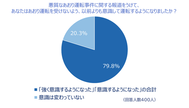 あおり運転をされた経験のあるドライバーは72.5%と、昨年と比較して19ポイント上昇し、半年の間でも24.1%となりました。また、悪質なあおり運転事件に関する報道をうけて、79.8%と多くのドライバーが、あおり運転を受けないよう以前より意識して運転をしています。