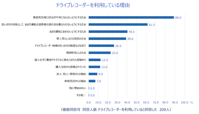 7. 現在ドライブレコーダーを利用している理由は「事故発生時に自分が不利にならないようにするため」が89%と過去最高値の結果に。加えて、現在使用しているドライブレコーダーの導入のきっかけは、「自動車事故やあおり運転のトラブルに関する報道・記事を見たため(58.5%)」「防犯対策のため(44%)」「安全運転意識を高めるため(33%)」と続く。
