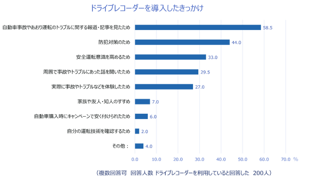 7.現在ドライブレコーダーを利用している理由は「事故発生時に自分が不利にならないようにするため」が89%と過去最高値の結果に。加えて、現在使用しているドライブレコーダーの導入のきっかけは、「自動車事故やあおり運転のトラブルに関する報道・記事を見たため(58.5%)」「防犯対策のため(44%)」「安全運転意識を高めるため(33%)」と続く。