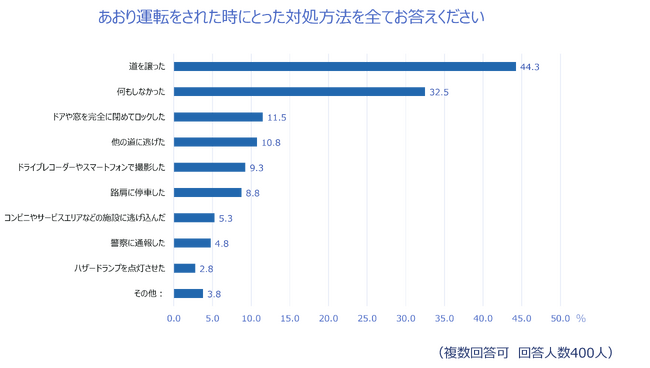 遭遇したあおり運転について聞いたところ、「あなたの自動車に激しく接近し、もっと速く走るように挑発してきた」が76.5%、続いて「必要のないハイビームをされた」が22%でした。また、あおり運転をされた際にとった行動としては、「道を譲った(44.3%)」「何もしなかった(32.5%)」と、あおり運転をやり過ごしたドライバーが目立つ結果となりました。