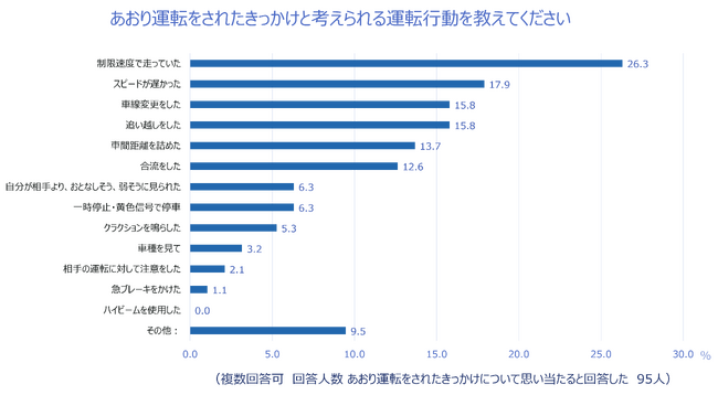 思い当たることがある人が考えるきっかけは、「制限速度で走っていた(26.3%)」「スピードが遅かった(17.9%)」が多い結果に。