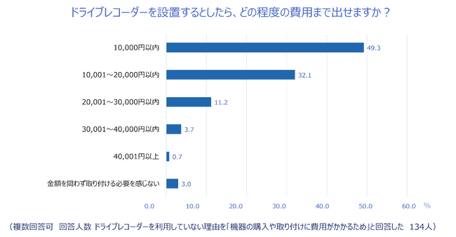 ドライブレコーダーを利用していないドライバーを対象に、その理由を聞いたところ、「機器の購入や取り付けに費用がかかるため」が67%で最も多くなりました。また、「ドライブレコーダーを設置するとしたら、どの程度の費用まで出せると思いますか?」との問いには、10,000円以内が49.3%、20,000円以内が32.1%と回答しました。なお、「金額を問わず取り付ける必要を感じない」人は3%と少ない結果となりました。