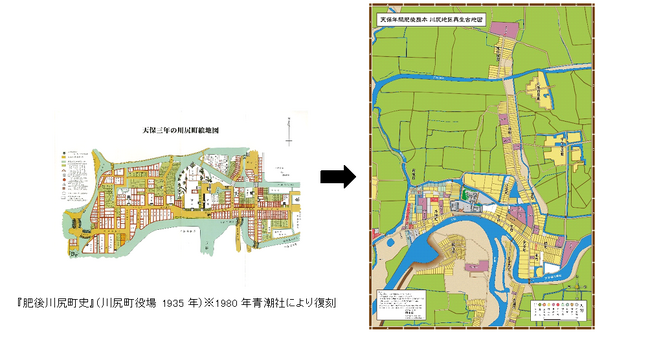 天保3年の川尻町絵地図や各種史料を元に、緯度経度や文字を調整した再生古地図を制作し、イラストマップをスマホやPC上で見られるambula mapに掲載しました(https://web.ambula.jp/ambula_web/dist/?ui=F13QU8LD&mi=565&h=true&bd=true&bg=true&in=true&openExternalBrowser=1)。