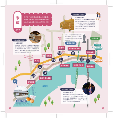 川尻地区の見所を3つのエリアに分け、エリア毎の地図とスポットを掲載しており、まち歩きに便利なサイズです。歴史的建造物をはじめ、まち歩き案内人おすすめのスポットも多数掲載しています。