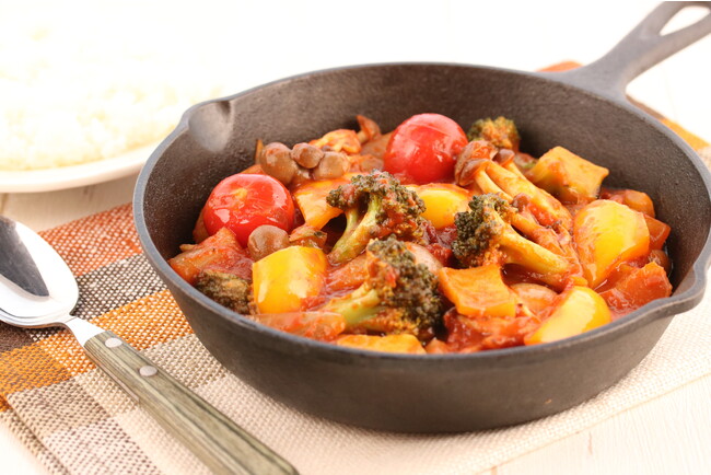 上記同様下処理し、旭化成ホームプロダクツ「ジップロック(R)フリーザーバッグ」に入れ、パナソニック冷蔵庫の「はやうま冷凍」で鮮やかに冷凍されたブロッコリーをまるごと使用しています。カゴメ「基本のトマトソース」を使用し、野菜たっぷりのカレーに仕上げています。
