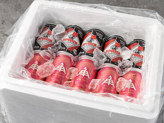 ヒエドリはドリンクを発泡スチロールのクーラーボックスに入れ、氷で冷やした状態でお届けするドリンクデリバリーです。冷蔵庫がない環境でも、常温保管*で冷たい状態が6時間続き、パーティーの最後まで美味しいドリンクがお楽しみいただけます。お料理や参加者に合わせたプラン選びができるよう、本格的なクラフトビールがセットになったプランから、定番アルコールで構成されたプランまで、幅広いラインアップを取り揃えました。配達時間を30分単位でお選びいただくことができるので、催事の時間に合わせて冷えたドリンクをお届けします。