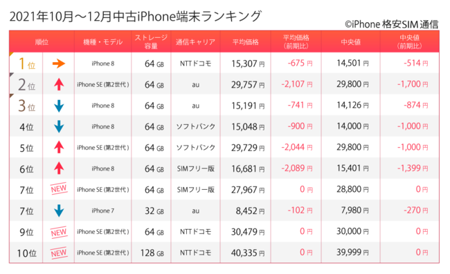 毎年、iPhoneの新機種が発売される9月〜10月頃には、中古スマホの取引数が増加する傾向があり、これにより今回も取引数が増加したと考えられます。iPhone 13シリーズの発売により、買い替え需要が高まり、発売から時間が経っていたiPhone SE(第2世代)が中古市場に出てきたことで、大きな順位変動が見られました。これまでiPhone 8は三四半期連続で上位3位を独占していましたが、今回は独占ならず、2位にauのiPhone SE(第2世代)がランクイン。10位までの半数がiPhone SE(第2世代)と、中古取引市場のトレンドが大きく刷新されました。