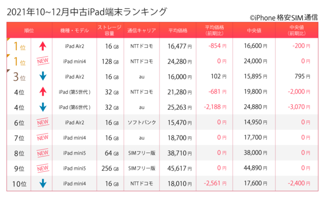 iPad全体の取引数は、前回の調査(2021年7月〜9月)と比べ10.0%増。iPad Air 2とiPad(第6世代)の取引数の活発化は継続していますが、今回の調査からiPad mini 4とiPad mini 5の順位が上昇しています。Apple Pencil(第1世代)非対応のiPad mini 4は2万円前後、対応するiPad mini 5は4万円前後と取引価格に大きな差が生じる結果となりました。