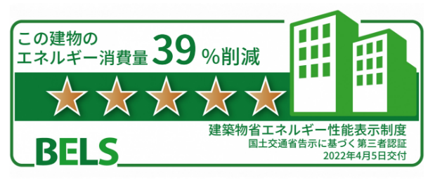 BELSとは、Building-Housing Energy-efficiency Labeling System(建築物省エネルギー性能表示制度)の略称で、建築物省エネ法第7条に基づき建築物の省エネルギー性能を第三者が評価するものです。基準となる一次エネルギー消費量に対し、この建物がどれだけの割合で一次エネルギー消費量を削減するかを評価・表示します。