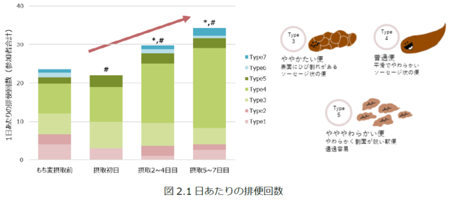 もち麦を摂取していない期間に比べて、もち麦の摂取開始から2~4日目、5~7日目では1日あたりの平均排便回数が増加しました(図2,*: p<0.05 対応のあるt検定)。この排便回数の増加は健康な便(Type3〜5)の増加に起因していました(図2, #:p<0.05 カイ二乗検定)。