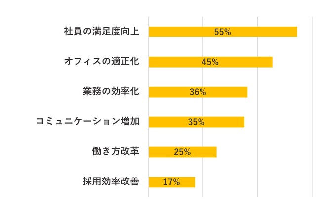 今回、オフィスや働き方の見直しをした理由は、「社員の満足度向上」が55%、「オフィスの適正化」が45%でした。