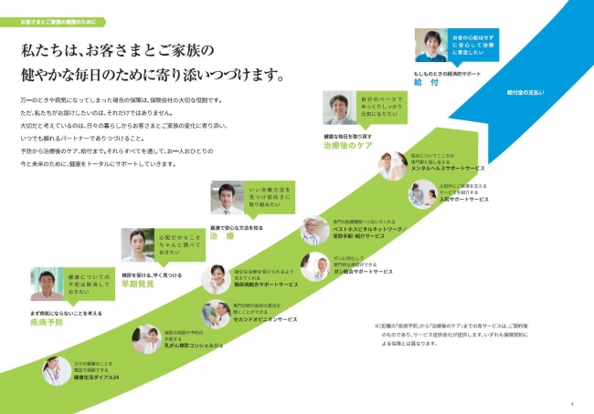 お客さまは将来にわたる健康上の問題を抱えたときの最新の保障やサービスだけではなく、日々の健康のためのより一層のサポートを望み、期待されています。このようなお客さまの声にお応えし、疾病予防、早期発見、治療、そして病後のケアに至るまで、健康に関する充実したサポートやアドバイスを提供いたします。