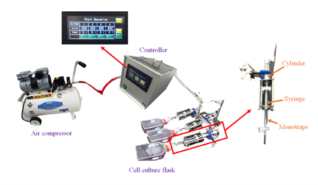 以前の研究※で、「ヘキセノール」という臭気物質が肺がん細胞(A549)で顕著に放出されうることを報告しましたが、臭気物質の生合成経路は不明なままでした。本研究ではまず、測定が難しい臭気物質を効率的に捕集し測定できる装置VEM-1(図2)の開発をジーエルサイエンスと共同で行いました。このVEM-1を用い、正常細胞とがん細胞それぞれについて、10種類の異なる培地条件における臭気合成量を比較しました。その結果、低酸素、乳酸濃度上昇に連動して臭気合成が増大することがわかりました。そこで生合成に関係すると思われる酵素をin vitroで反応させ、酵素活性測定と酵素反応の生産物となる臭気物質の同定を行うとともに、低酸素応答や乳酸代謝と臭気の生合成の関連について、遺伝子発現比較を行いました。その結果、がん細胞において、脂質二重膜の脂質過酸化反応に関係する遺伝子発現群の発現増加が確認できました。