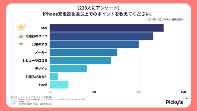 アンケート調査の結果、1番回答が多かったものは「価格」で、次に「充電器のタイプ」「充電の早さ」といった性能や品質が後に続く形となりました。
