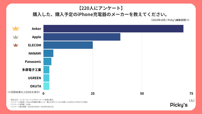 iPhone充電器を購入する時には一番選ばれたメーカーは「Anker」となり、Appleの純正品を買うという回答は2番目になりました。