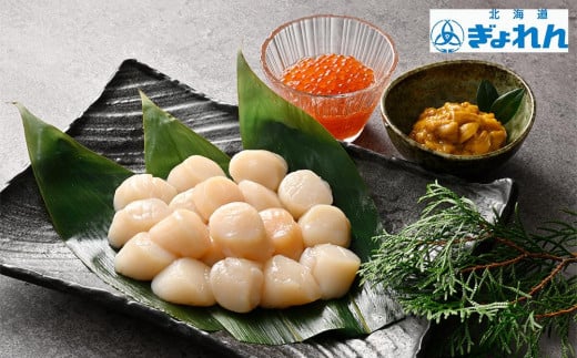 北海道産の「ホタテ貝柱」・「いくら醤油漬」・「一夜漬粒ウニ」の贅沢に詰め合わせました。