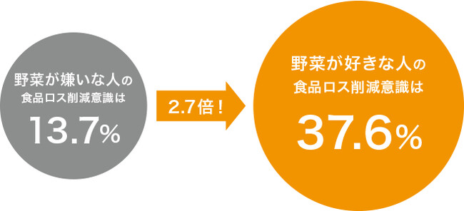 食品ロス削減について意識あり(そう思う)と回答した割合は、野菜が嫌いな人は13.7%なのに対し、野菜が好きな人は37.6%と約3倍も高いことが明らかに。