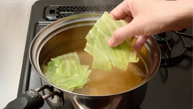 冷凍すると細胞が破壊され、解凍したときに水分が溶けて流れ出ます。冷凍キャベツから溶け出た水分に含まれた旨みや栄養は汁物に混ざり、おいしく仕上がります。