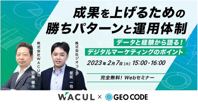 Webマーケティングとクラウドセールステックを展開する株式会社ジオコード(本社:東京都新宿区、代表取締役:原口大輔、東証スタンダード:7357)は、2月7日(火)に株式会社WACULと共催セミナー「データと経験から語る!デジタルマーケティングのポイント〜成果を上げるための勝ちパターンと運用体制〜」をオンラインで開催します。