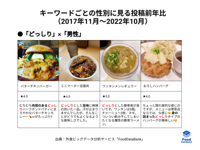 「どっしり」×「男性」の投稿では、”肉感のある”や”身の詰まった”といった重量感のある料理や、”旨味”や”豚骨臭”といった味覚や嗅覚も巻き込んだ存在感のある料理の評価が高い傾向にあります。