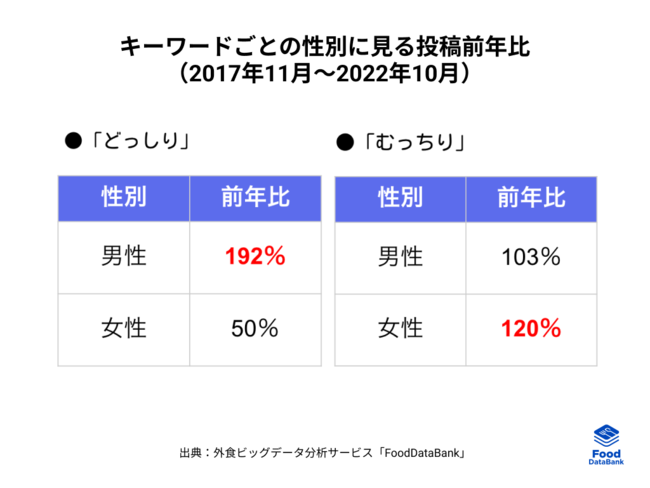 一方で「むっちり」×「女性」の投稿は、”詰まった感じ”や”硬め”というように、凝縮された密度のある料理が高評価の傾向にありました。