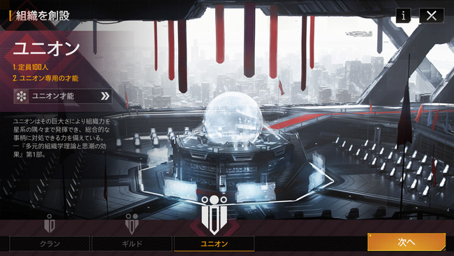 「クラン、ギルド、ユニオン」の3種類の基礎組織は「星系協定」と「連合協定」を締結することで、組織ごとに異なる「連合体」(クランは「財団」、ギルドは「兵団」、ユニオンは「連盟」)を形成できます。「連合体」の人数は最大で150人となっており、各組織は連合体単位で星系内の星系評価に共同で参加します。