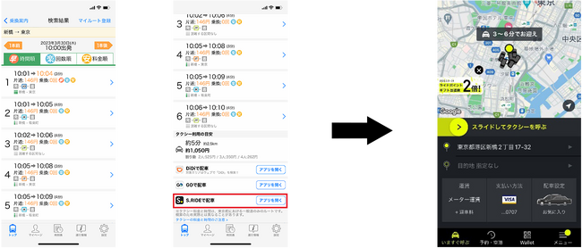 今回の連携により、「Yahoo!乗換案内」アプリのルート検索結果画面から「S.RIDEで配車」ボタンをタップするとS.RIDEアプリの起動が可能になります。
