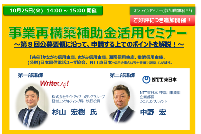 NTT東日本 神奈川事業部は、かながわ信用金庫、さがみ信用金庫、湘南信用金庫、横浜信用金庫、日本電信電話ユーザ協会と共に、事業再構築補助金活用セミナーを開催します。