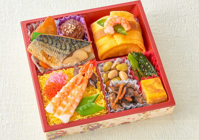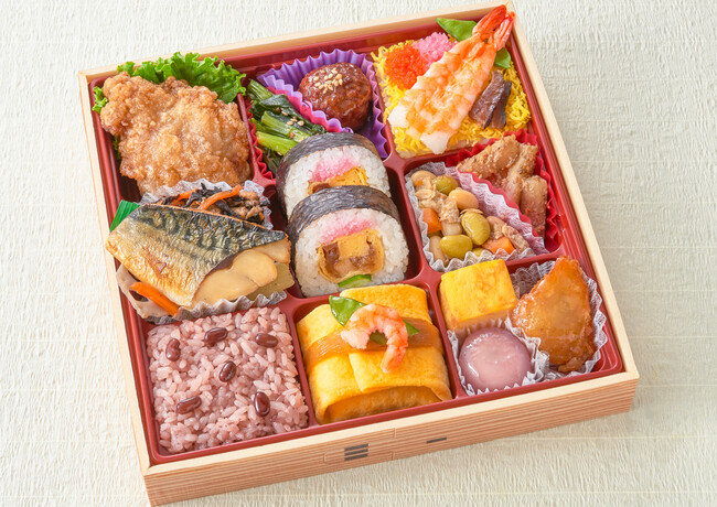 9マスに区切られた多品目の豪華なお弁当です。五目舎利を薄焼き玉子の優しい甘さで包み込んだふくさ寿司や赤飯や小僧寿しの元祖太巻きに加え、11種類のお惣菜が入った豪華なお弁当です。